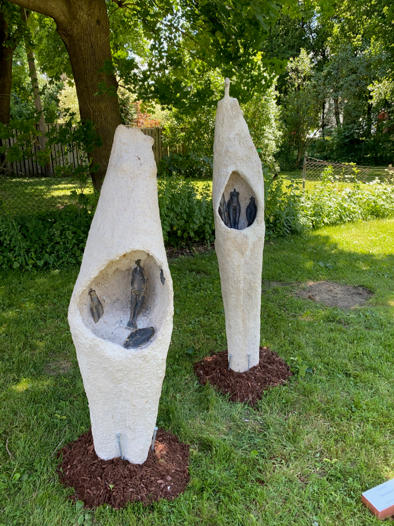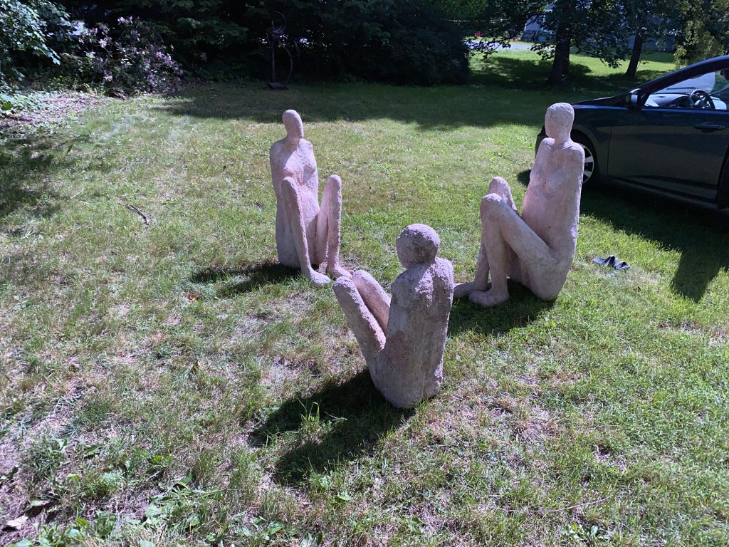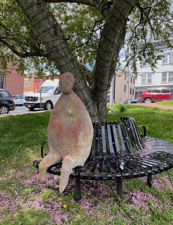This May Highland Falls opened its outdoor Sculpture Art Walk.  The Art Walk, featuring sculptures, gives a quiet respite from Covid and a moment of peaceful inspiration and reflection.  On a lone bench a life-size concrete woman sits, watching passersby in their necessary activities, and waits for a conversation. She’ll sit and listen without interrupting you.  Figure Sitting on a Bench, in Ladycliff Park, is the creation of Jo-Ann Brody.  Not far away in the park a colorful mosaic Yoga bird, created by Barbara Galazzo and Carol Flaitz, with arms outstretched reminds us to socially distance and looks ahead to the day we can all hug again.