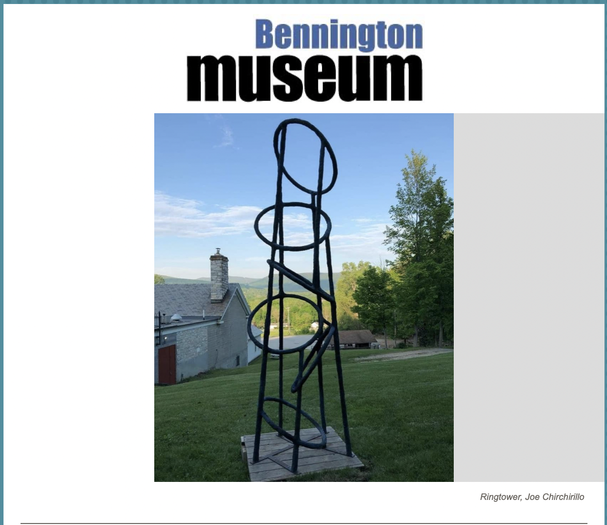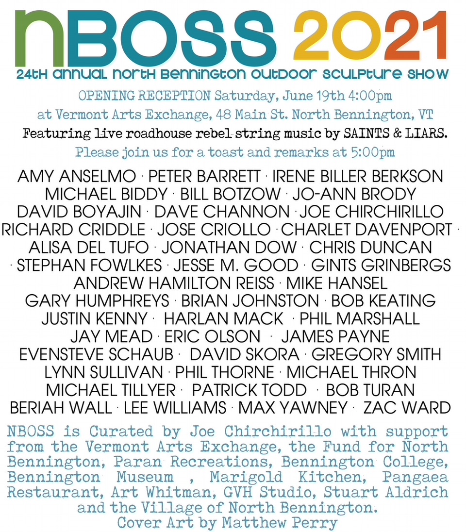 Now in its 24th year, the North Bennington Outdoor Sculpture Show (NBOSS) is the longest running outdoor sculpture exhibition in Southern Vermont. From June 19th to November 7th, large-scale outdoor works will be featured throughout the historic village of North Bennington, at the Hiland Hall Gardens, and on the 10-acre campus of Bennington Museum in Old Bennington. This exhibition is a must-see addition to the regional art trail that connects Southern Vermont cultural destinations such as Bennington Museum, Bennington College, and the Southern Vermont Arts Center with MassMoca, The Clark Art Institute, Williams College Museum of Art, Art Omi, Chesterwood, and The Mount. For the 9th year in a row, local artist Joe Chirchirillo will curate this premier cultural event, and for the 2nd consecutive year, he will be joined by Jamie Franklin at Bennington Museum. For the summer and fall of 2021, the team has brought together over 50 internationally recognized and emerging artists from the surrounding area with their works split between the two locations: 45 pieces in North Bennington (including 4 pieces at the Hiland Hall Gardens), and 29 pieces at Bennington Museum. These creations can be enjoyed at no cost and at the viewer’s convenience. Sculptures are available for purchase from the artists, and maps are available on-site.