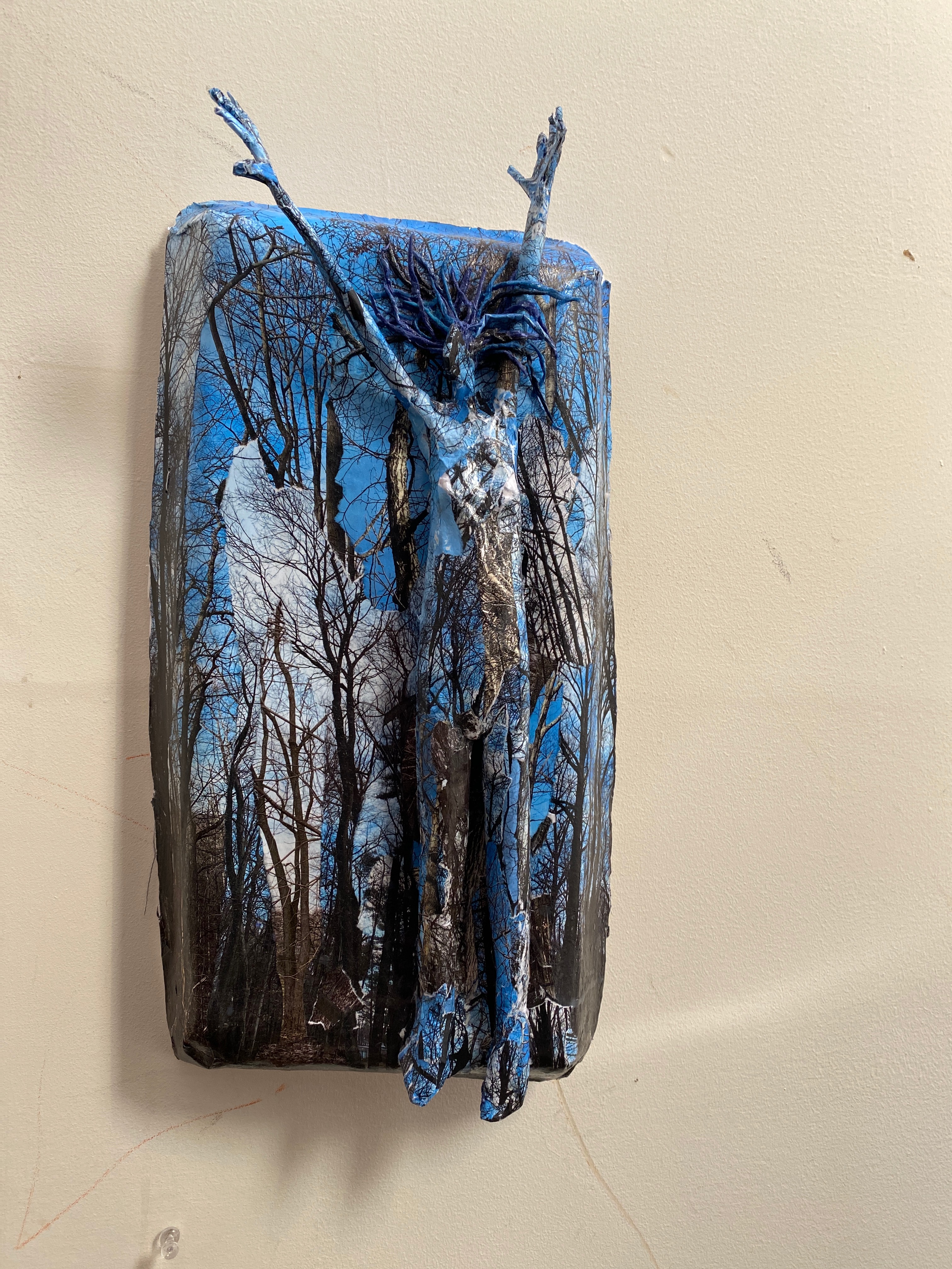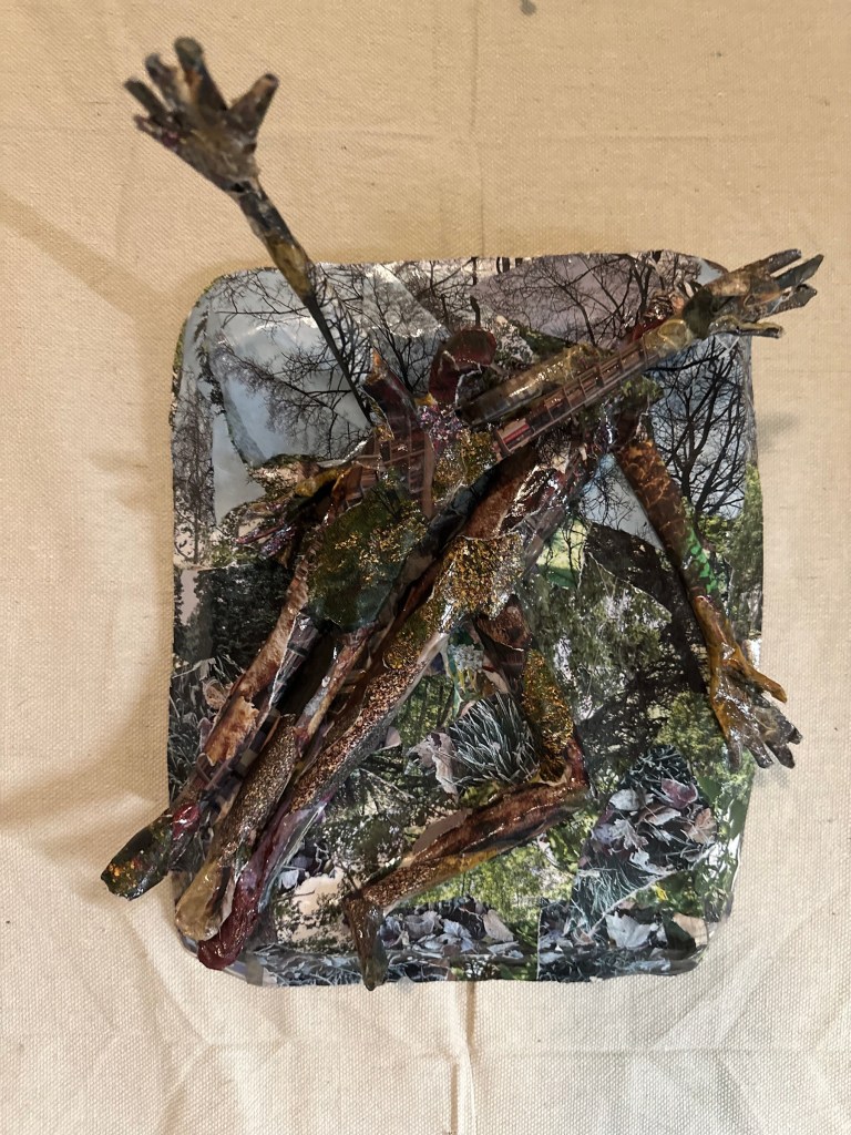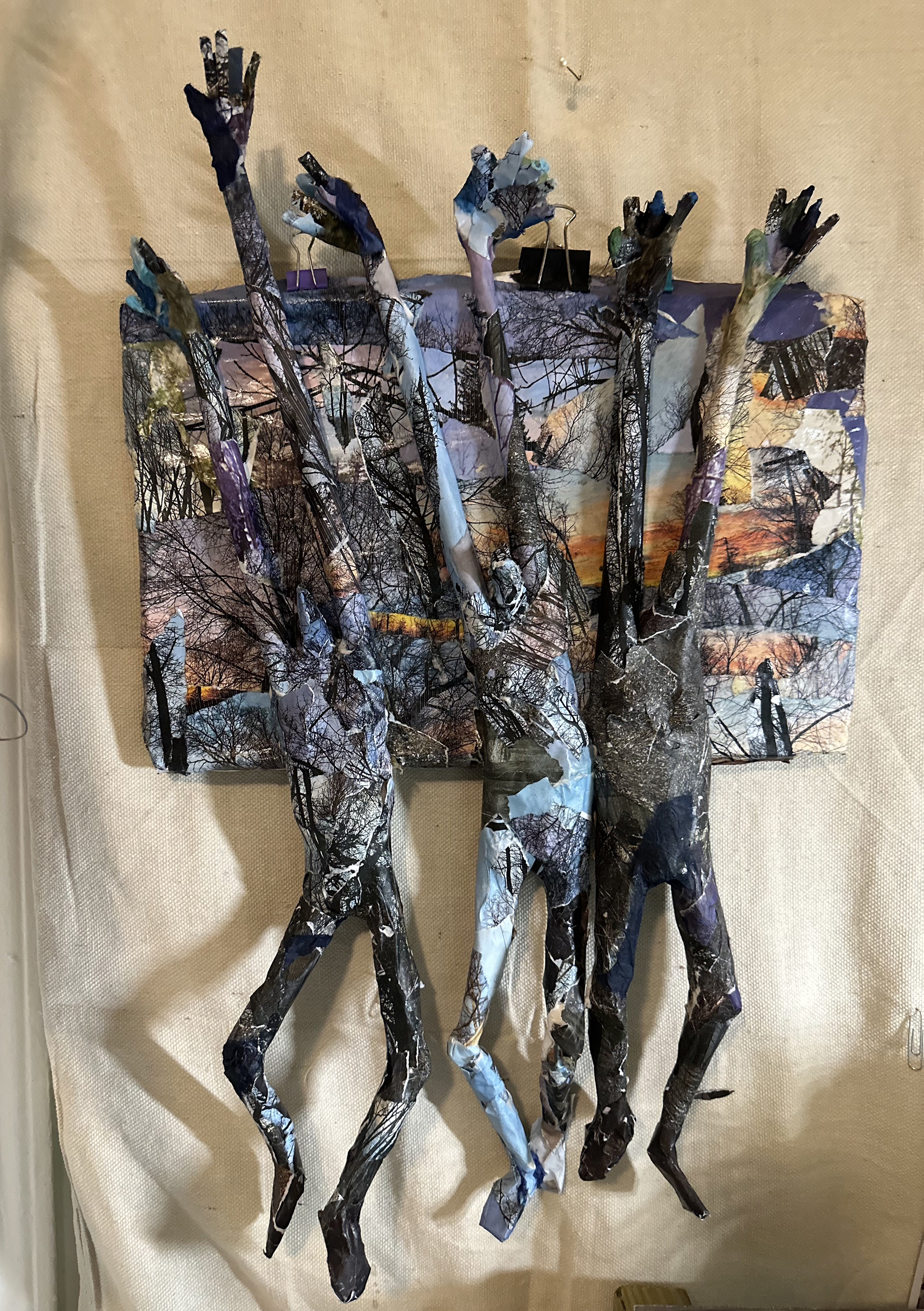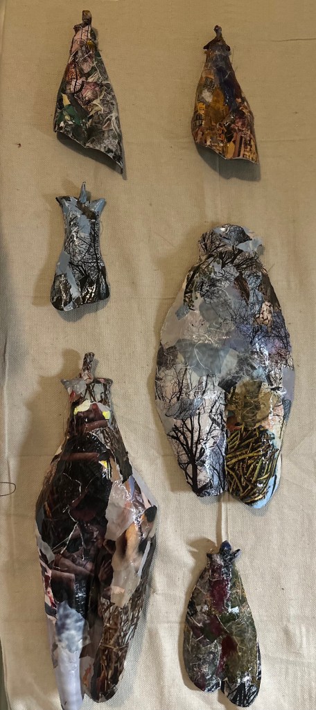 The work below is all papier mache created from images captured by Brody on her daily walks with the addition of magazine images and mulberry papers. Several of these images are works in progress.