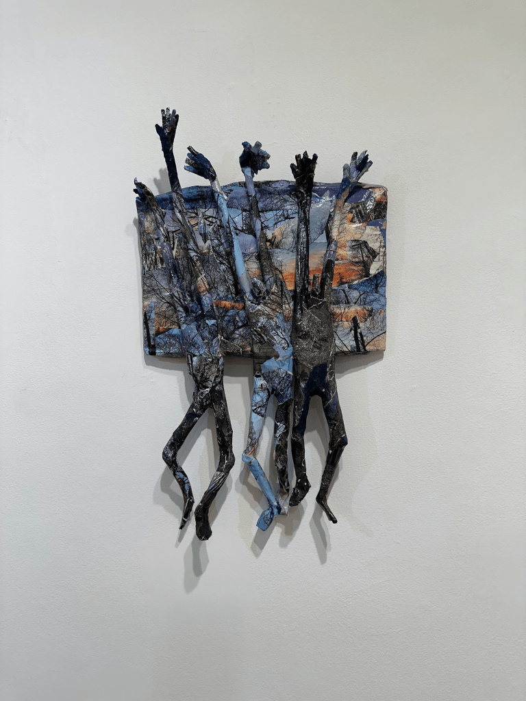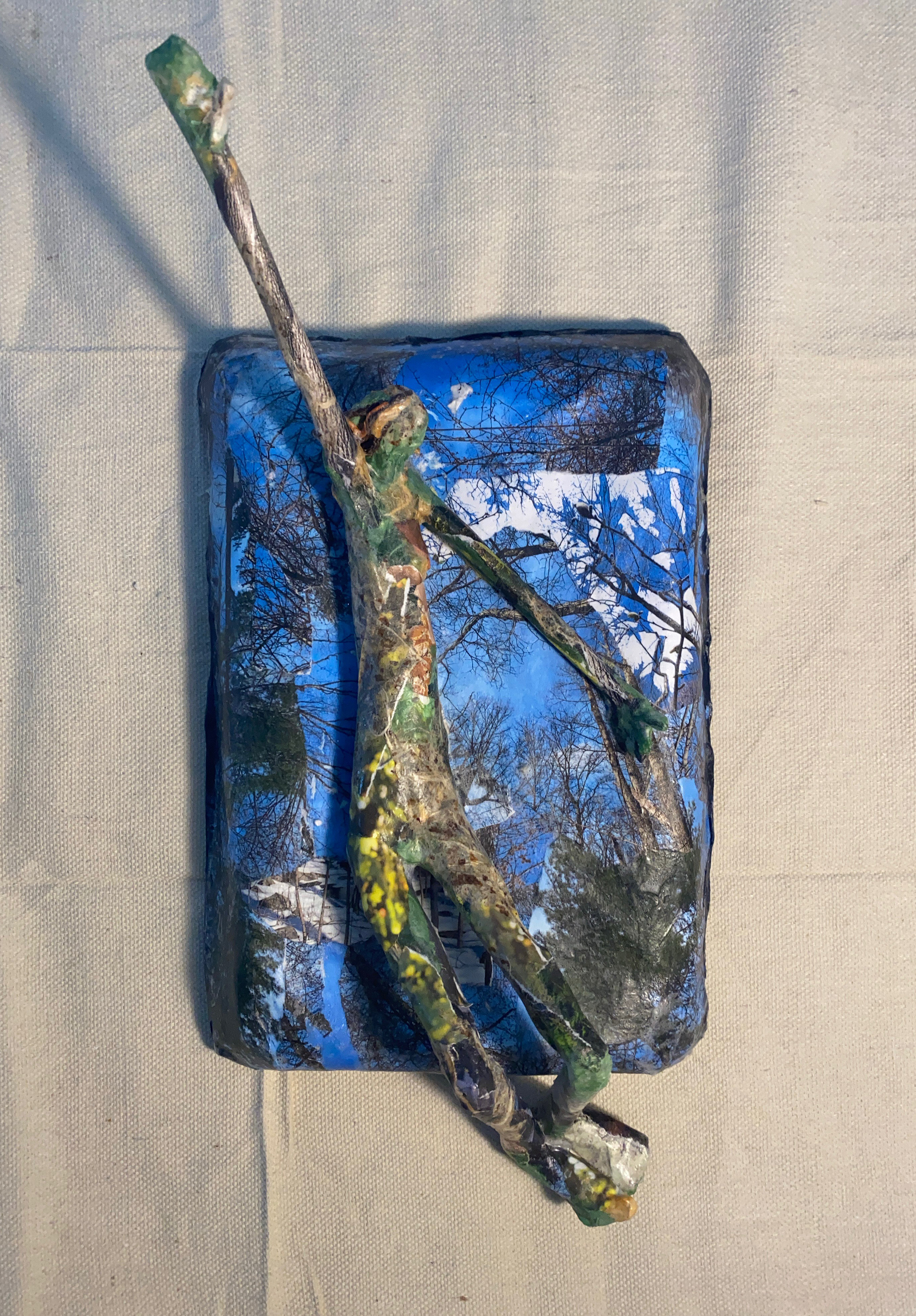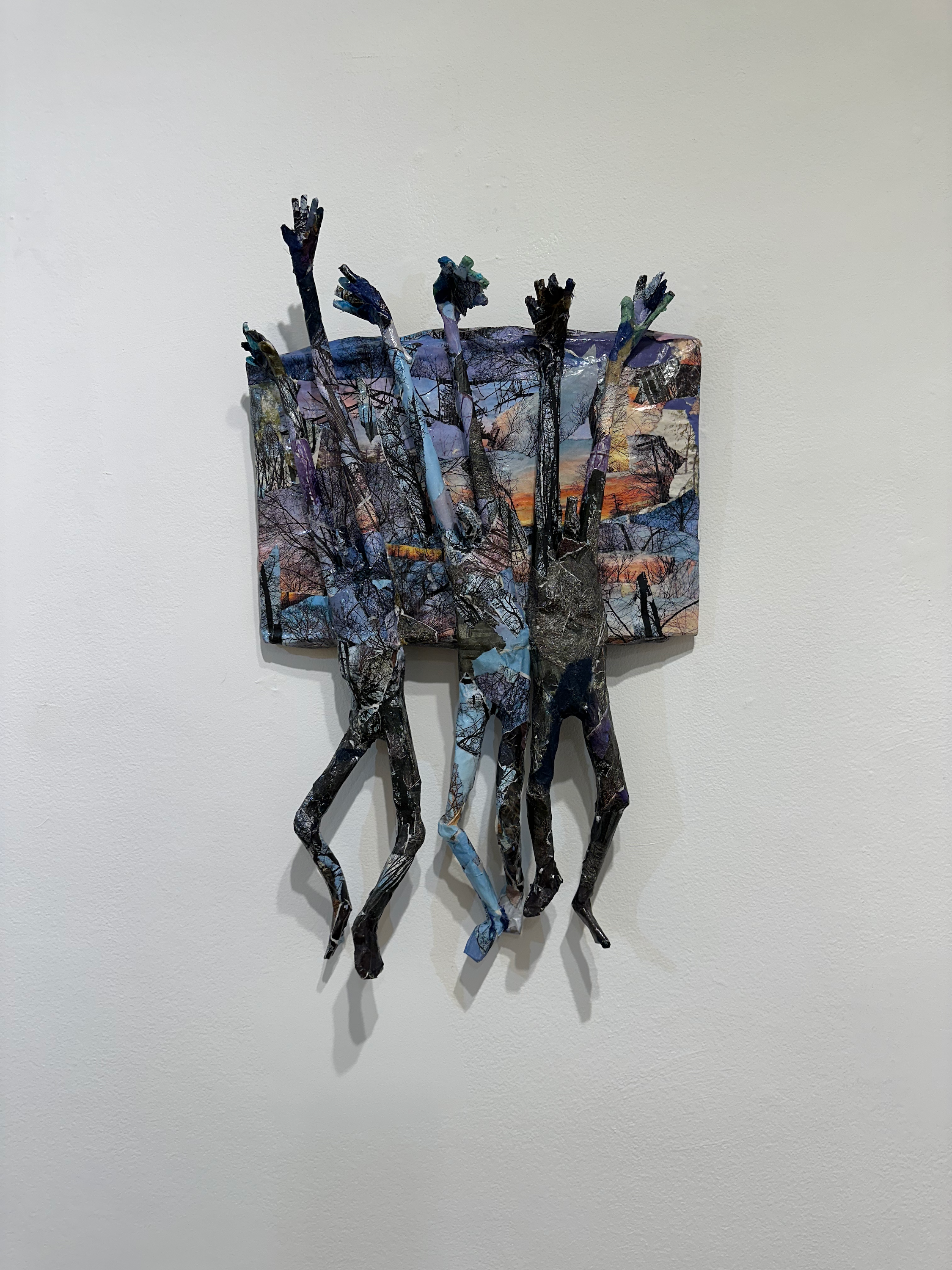 The work below is all papier mache created from images captured by Brody on her daily walks with the addition of magazine images and mulberry papers. Several of these images are works in progress.