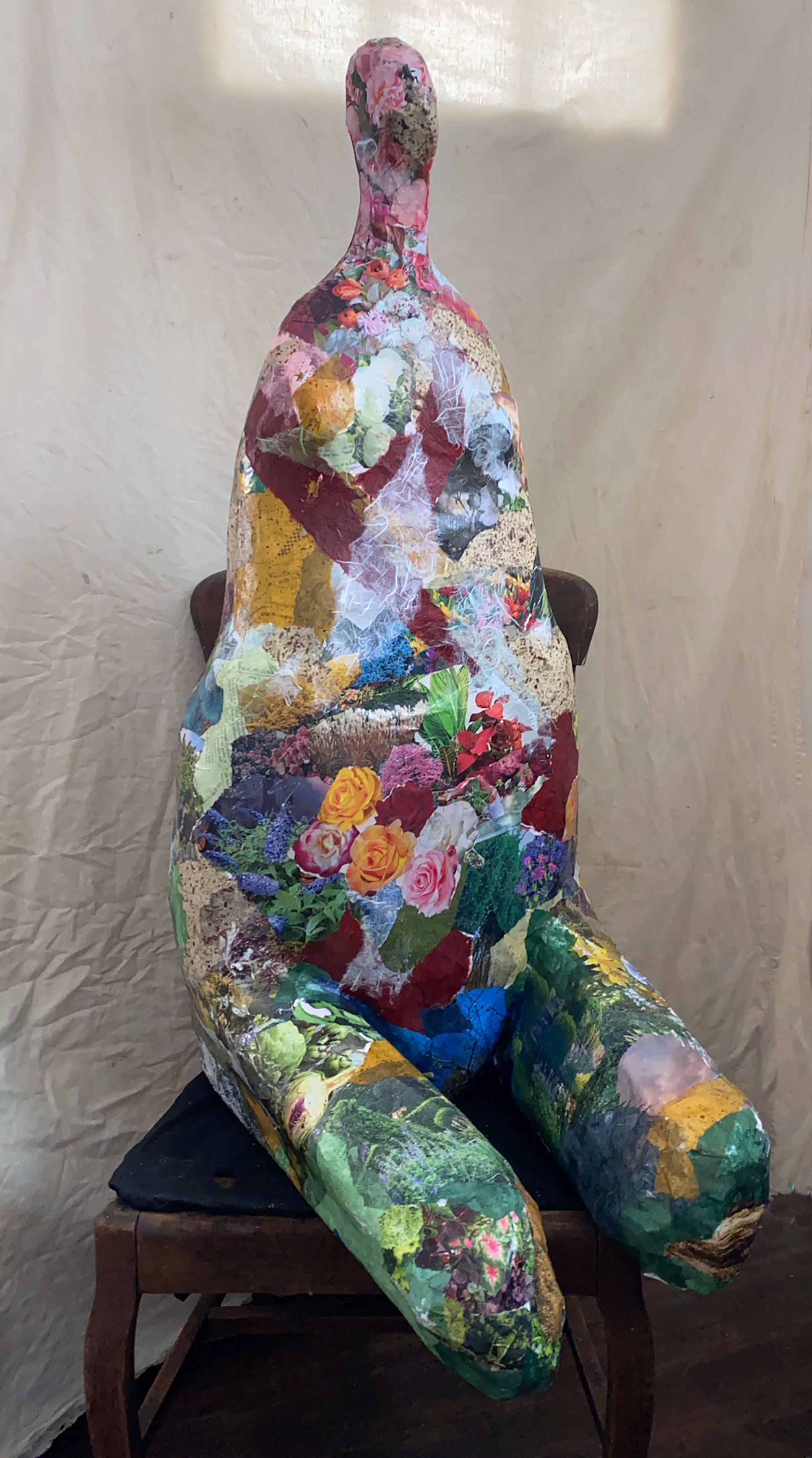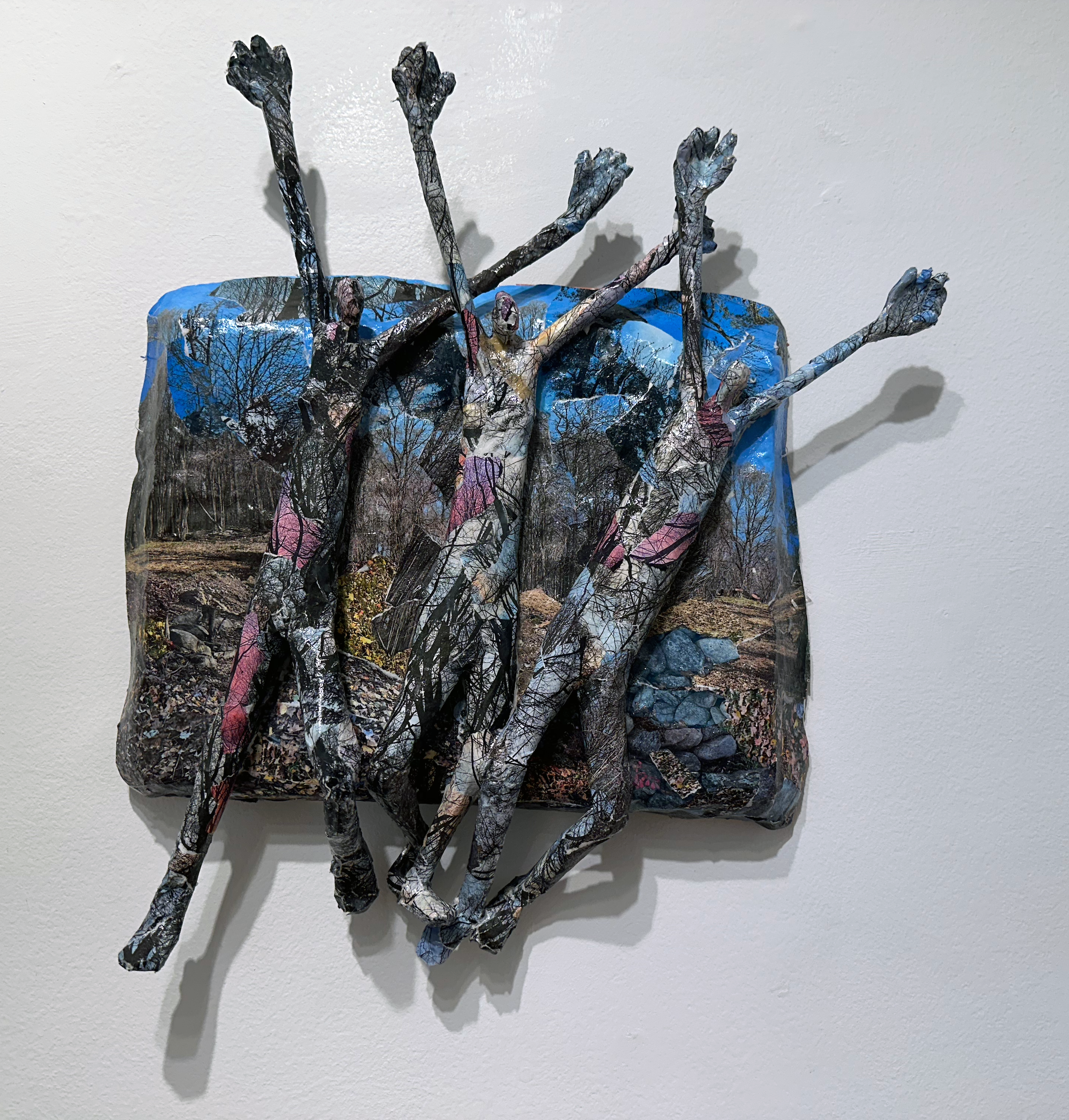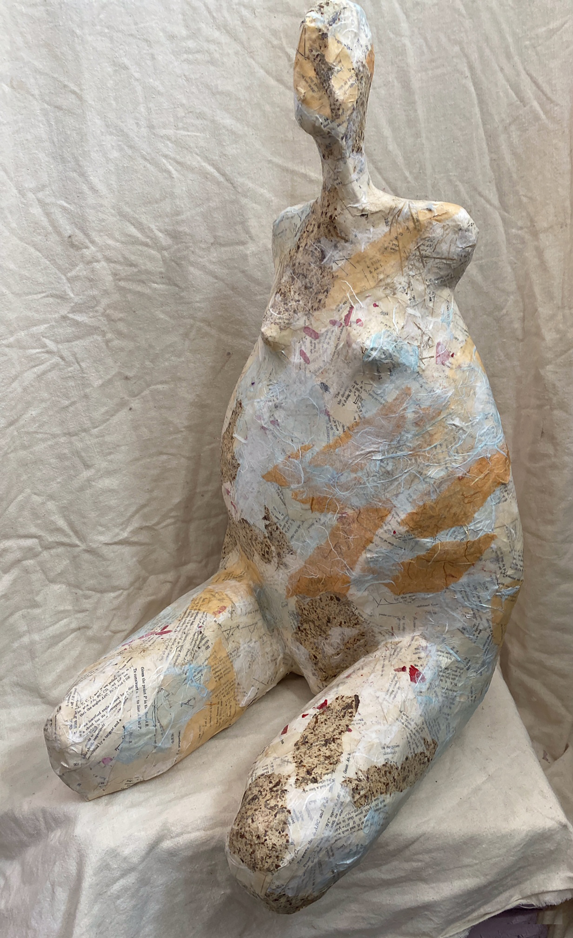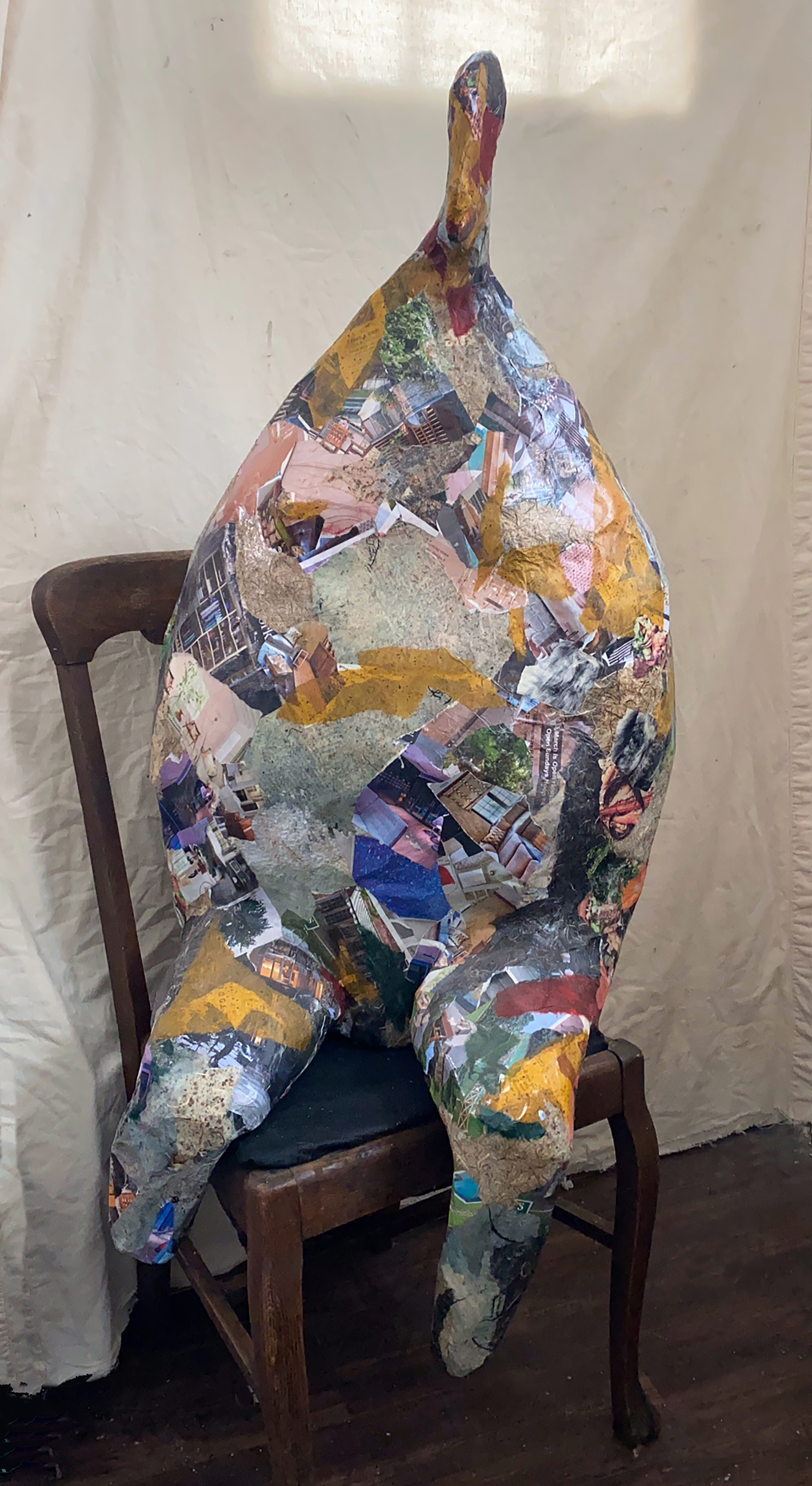 Papier mache is made from a mixture of papers, paper pulp, and glue. There is no separate armature. The structure comes from rolled paper tubes glued and papier mache-ed together. Mulberry paper and rice paper add to the texture and look in many of the pieces. Brody’s photos are laser printed in 8.5 x 11” size, then cut and torn and glued into place. Each piece is at least 3 layers and is then finished with varnish. ClayCrete, papier mache pulp mixed with glue and water provides volume as necessary and also is the surface of Kneeling Woman and Crouching Woman.