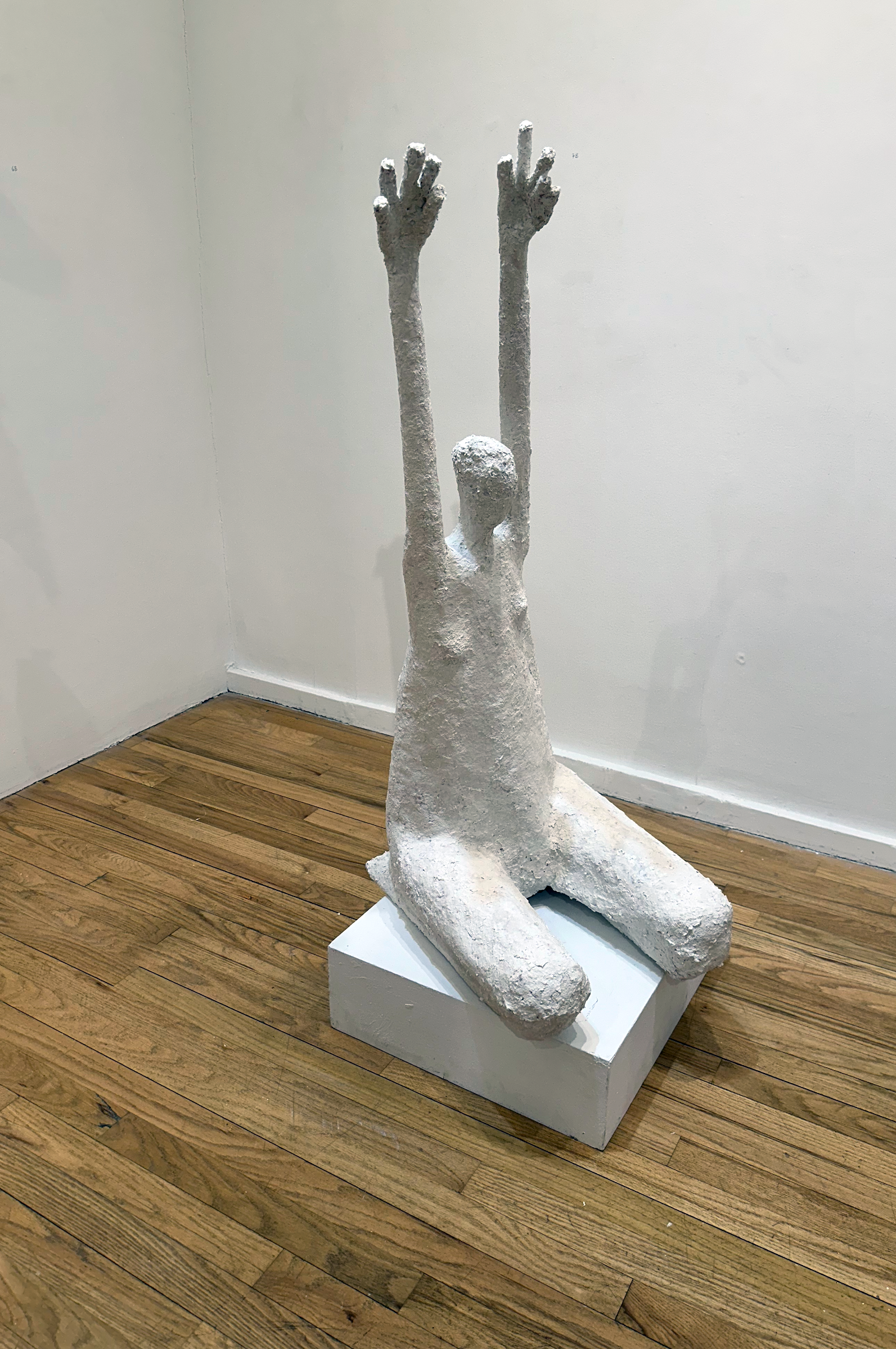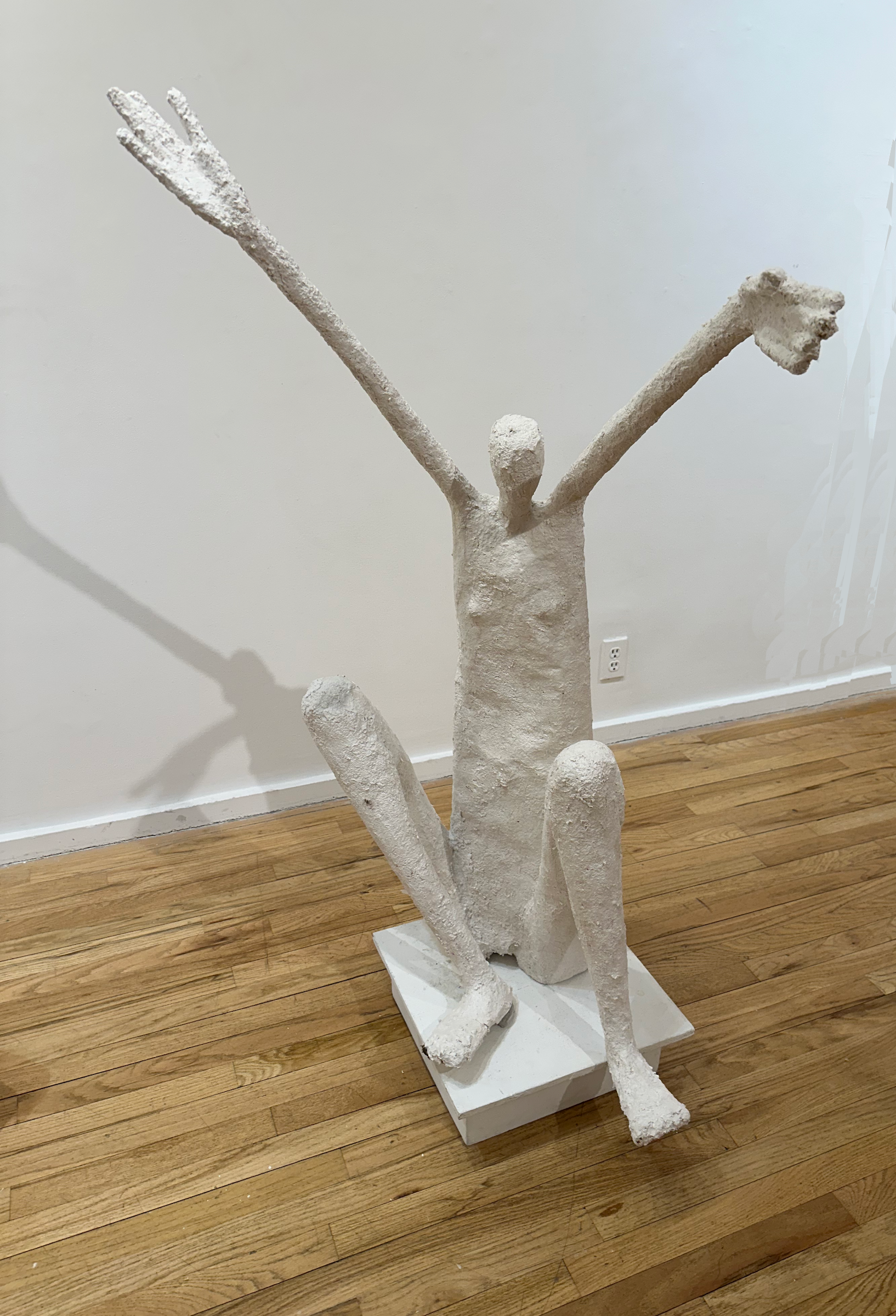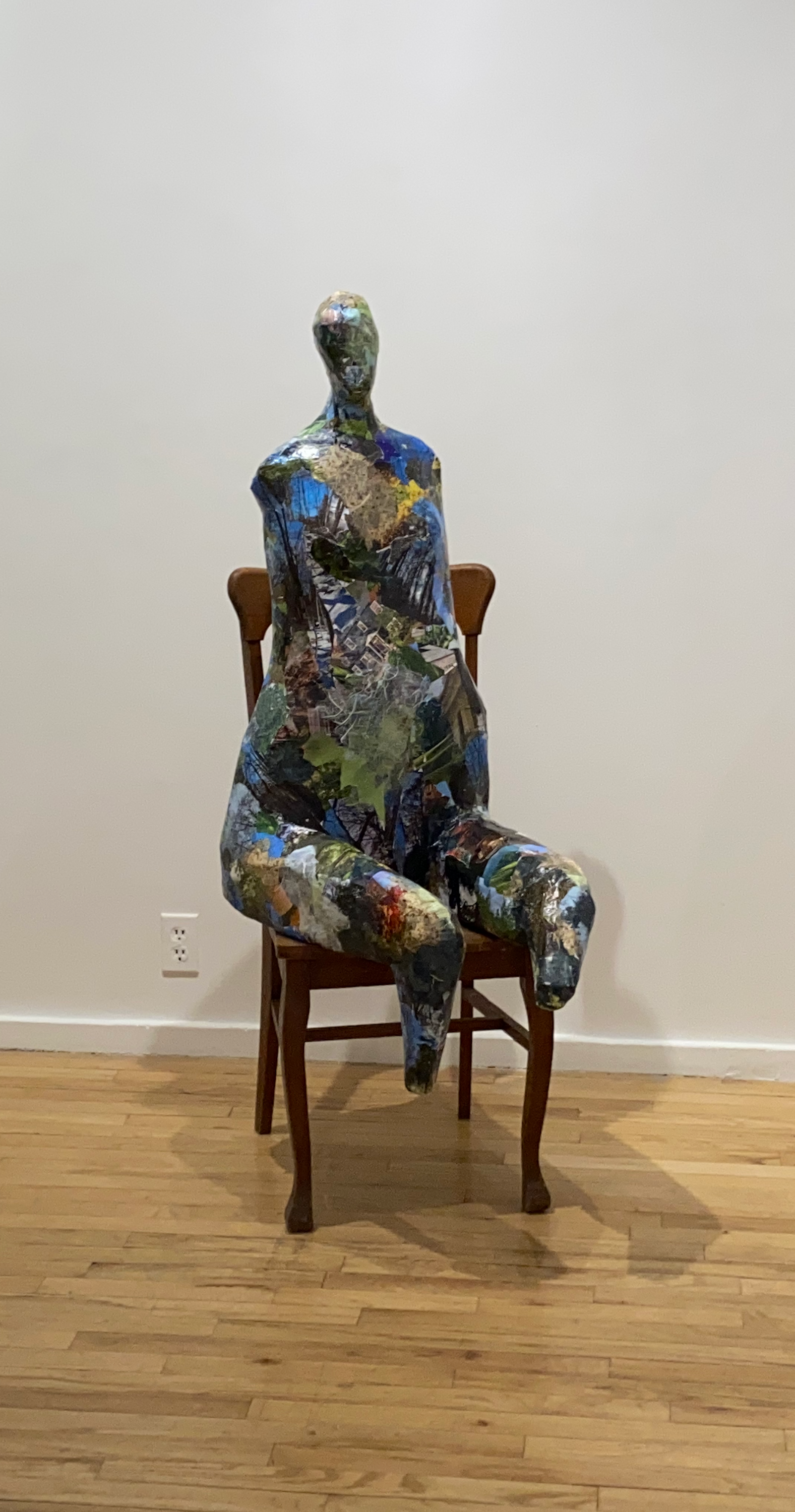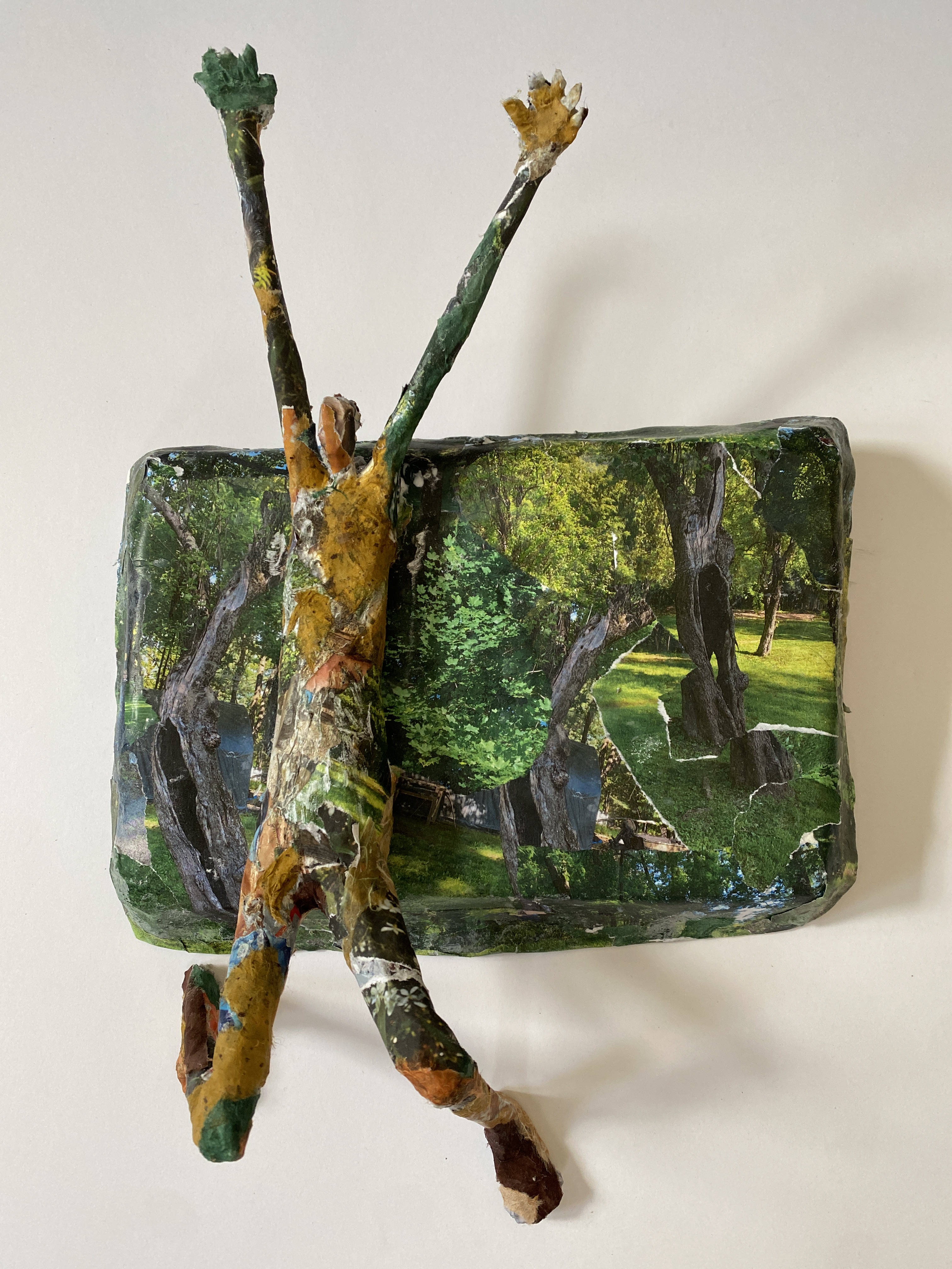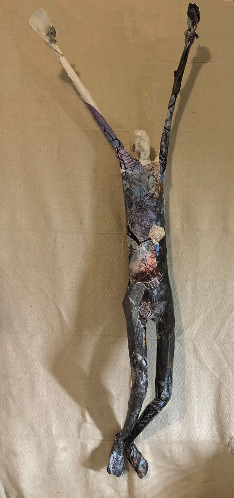 Papier mache is made from a mixture of papers, paper pulp, and glue. There is no separate armature. The structure comes from rolled paper tubes glued and papier mache-ed together. Mulberry paper and rice paper add to the texture and look in many of the pieces. Brody’s photos are laser printed in 8.5 x 11” size, then cut and torn and glued into place. Each piece is at least 3 layers and is then finished with varnish. ClayCrete, papier mache pulp mixed with glue and water provides volume as necessary and also is the surface of Kneeling Woman and Crouching Woman.
