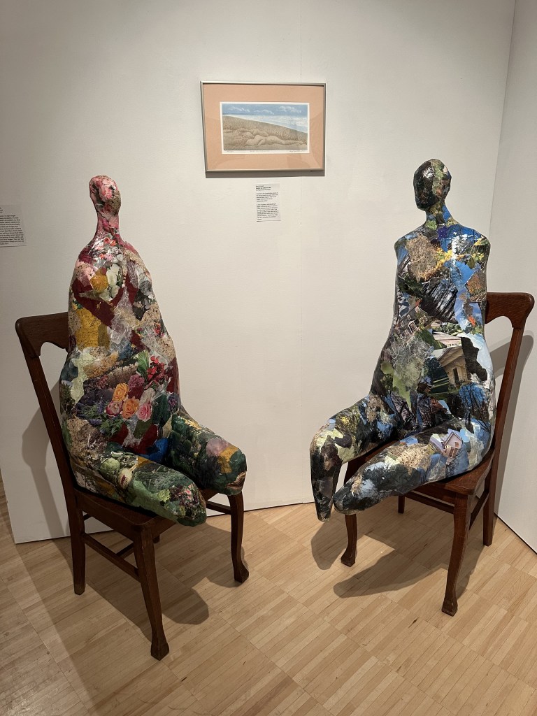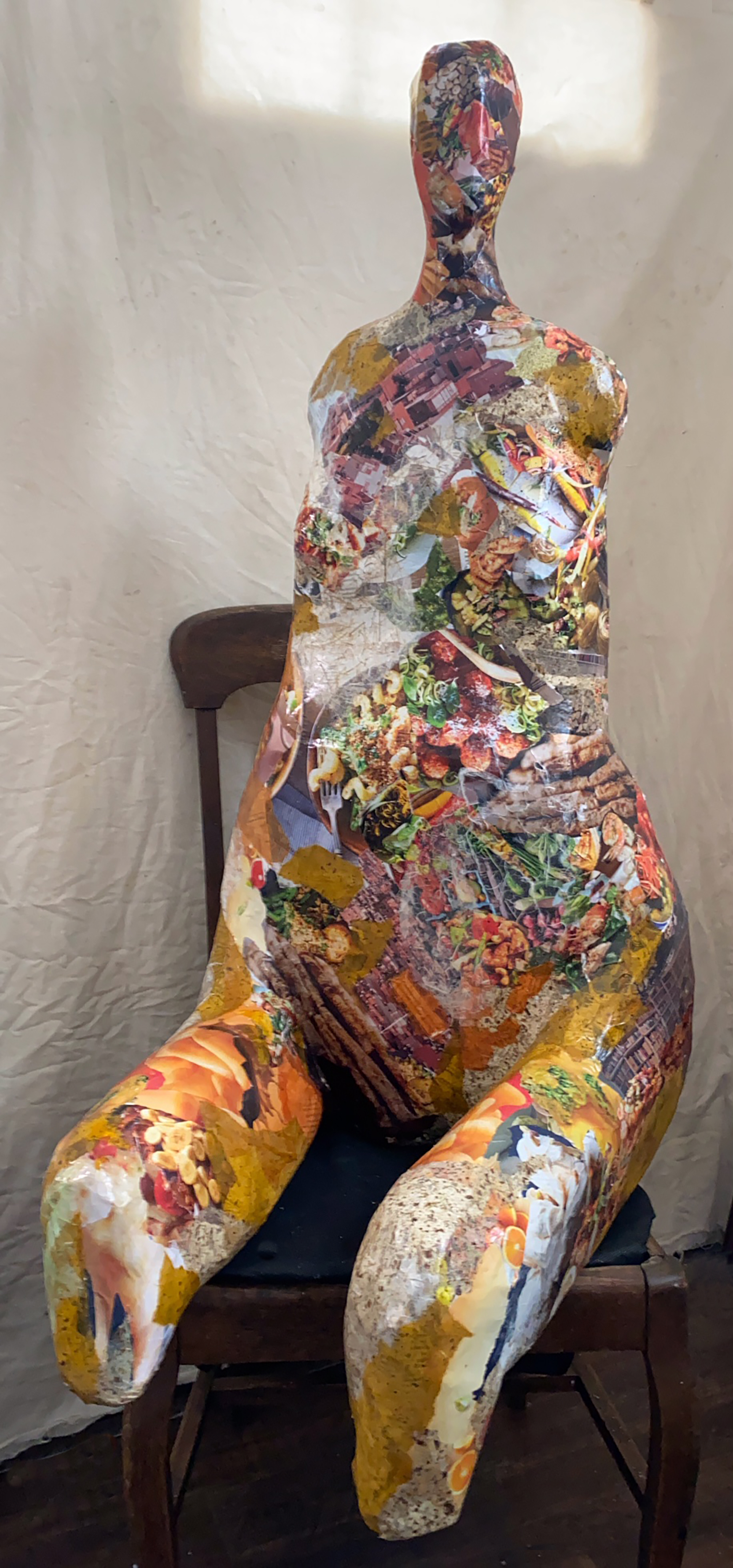 Brody started with clay sculpture; she moved to cement to create larger, life sized women. Both materials are from the earth and retained their earth tones; currently she is working in papier mache—still figurative but now with color and collaged image from her photography and from magazines and books. The forms are familiar but the addition of image and color adds a new dimension. There are references to her surroundings encountered on daily walks. Stance remains paramount to her work.