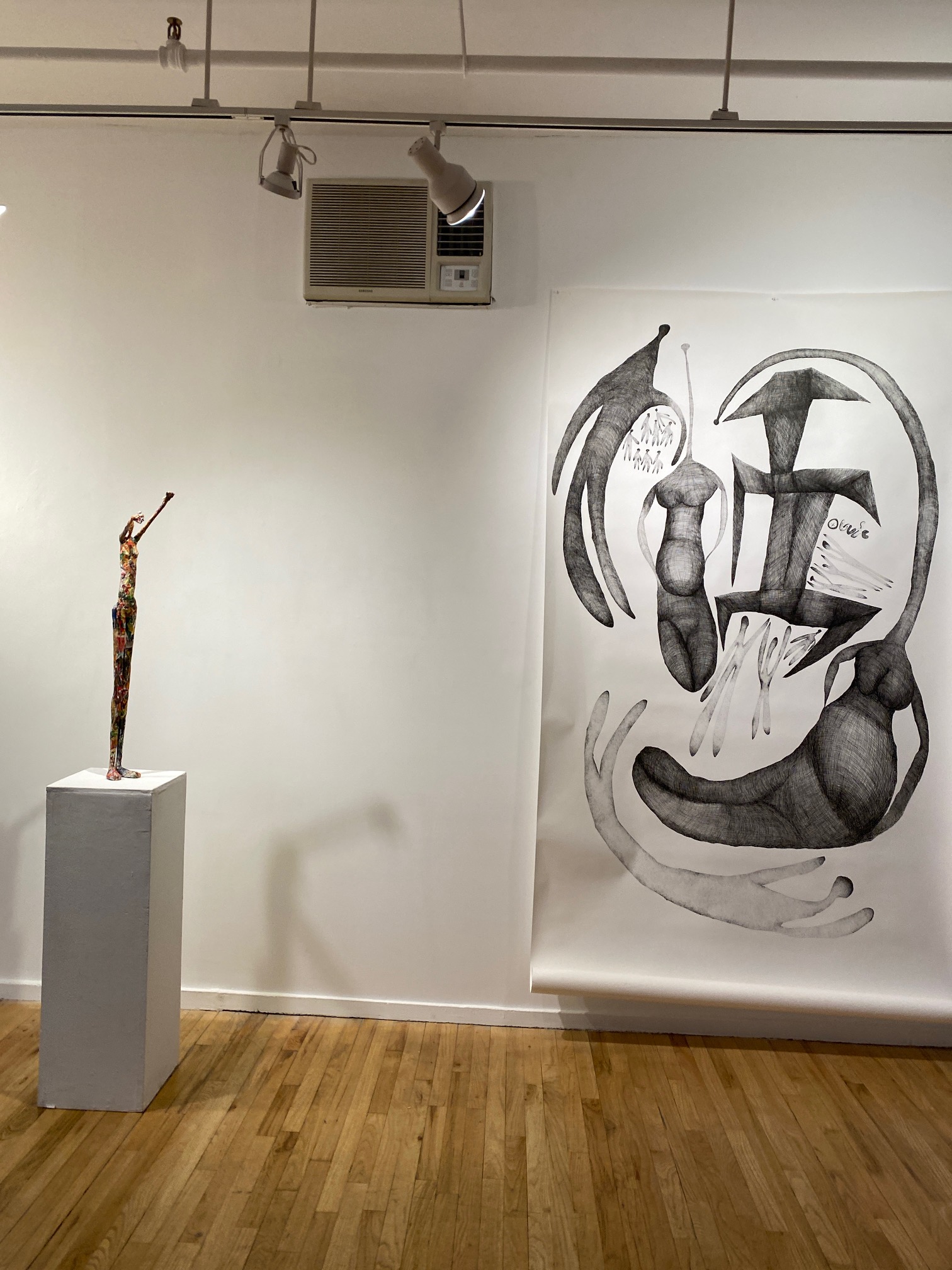 Their work and styles compliment each other. Both Ndoye and Brody are figurative artists but their approaches are unique to their individual concepts. Brody focuses on form and stance of her figures while Ndoye is trying to capture the fictional cultural milieu of her dolls.