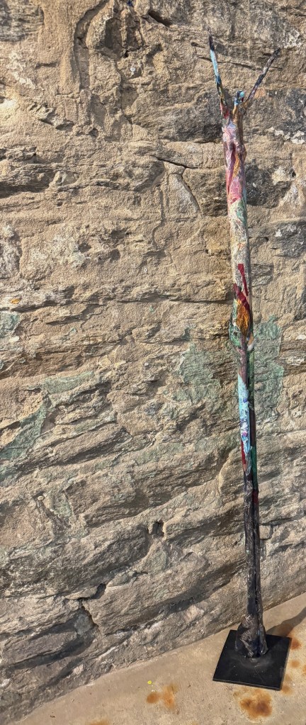 Stick Figure, Twig Arms, Paper mache over PVC pipe, 68.75 x 8.5 x 5 inches.