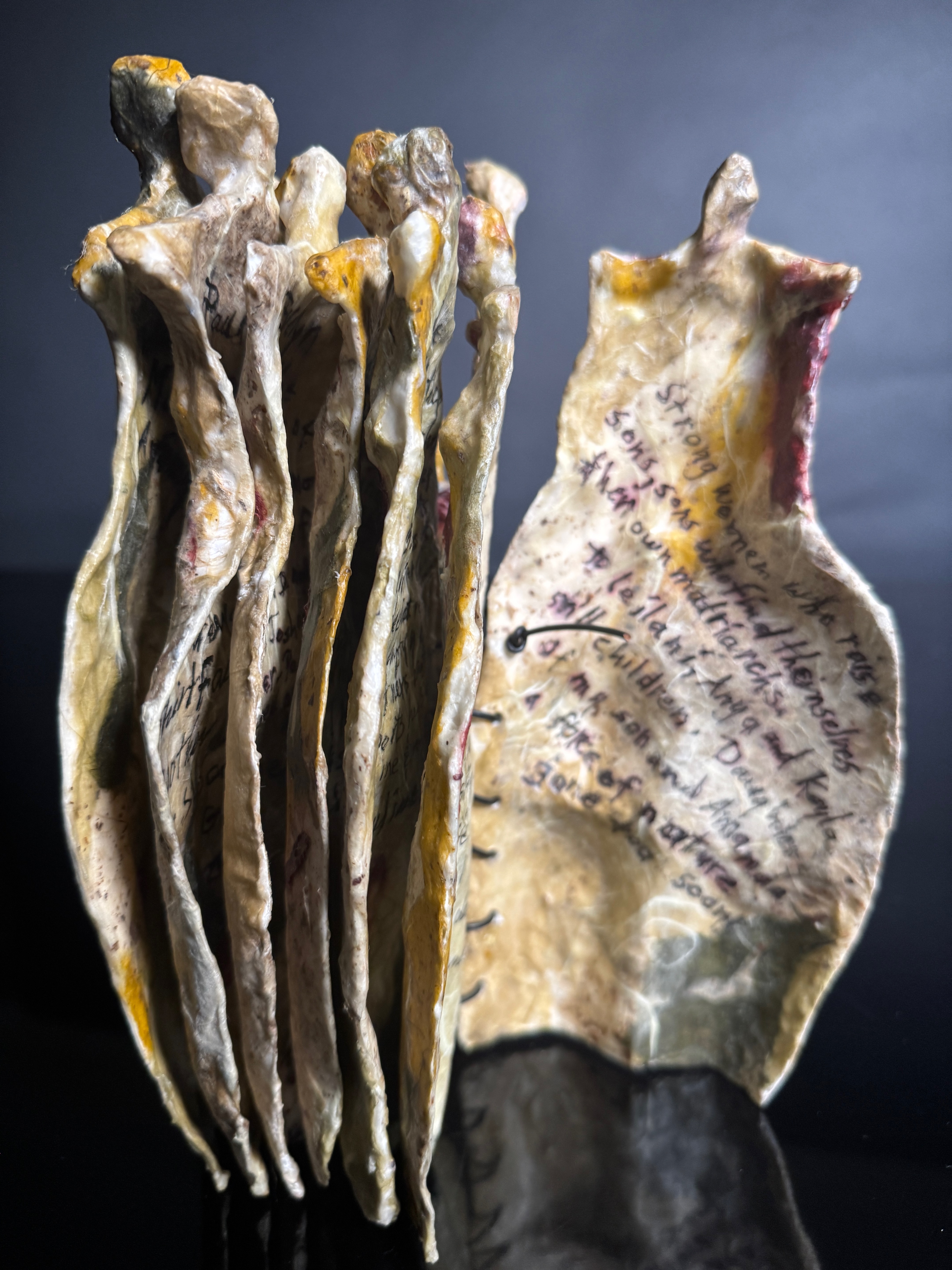 Matriarchy, 2025, Papier Mache and leather binding, 9 x 5.5 x 3 inches folded.